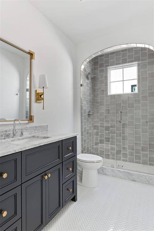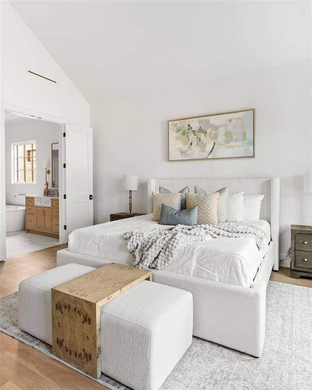 The first floor includes the primary suite and a secondary bedroom, offering flexibility for guests, a nursery, or an office. The primary suite serves as a private retreat with vaulted ceilings, a spa-inspired bath, and a generous walk-in closet. Upstairs, additional bedrooms and flexible spaces provide privacy, comfort, and versatility for home offices, media rooms, or guest accommodations.