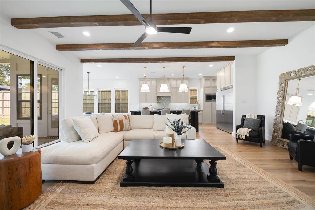 Step into next level style with this just completed 5-bedroom modern farmhouse that's anything but basic. From the moment you walk in, it's clear: this is where sleek design meets effortless luxury. Think soaring vaulted ceilings, exposed wood beams, and walls of glass that flood every inch with natural light. Wide-plank hardwood floors lead you into a dream kitchen built to impress ...oversized quartz and marble surfaces, a waterfall island, built-in coffee bar, walk-in pantry, and a full suite of pro-grade stainless appliances, including a commercial vent hood that means business. Grab coffee in the breakfast nook, or entertain like a pro in the open-concept living space, all under custom designer lighting that sets the mood.
