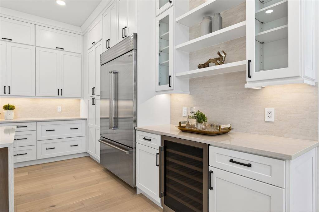 The grand great room features a 21-foot ceiling, abundant natural light, and a gas fireplace. The adjacent kitchen includes an oversized Taj Mahal Plus quartz island, white shaker cabinetry, a 48-inch Wolf gas range, full-size Sub-Zero refrigeration, and wide-plank white oak flooring throughout.