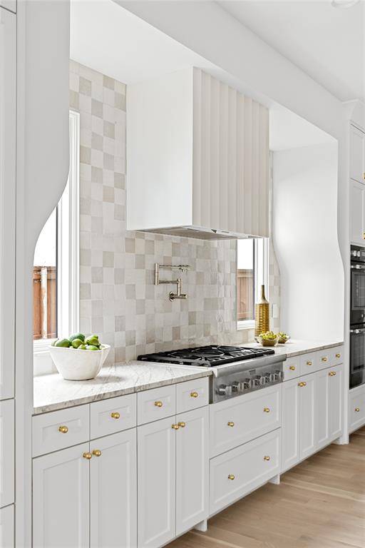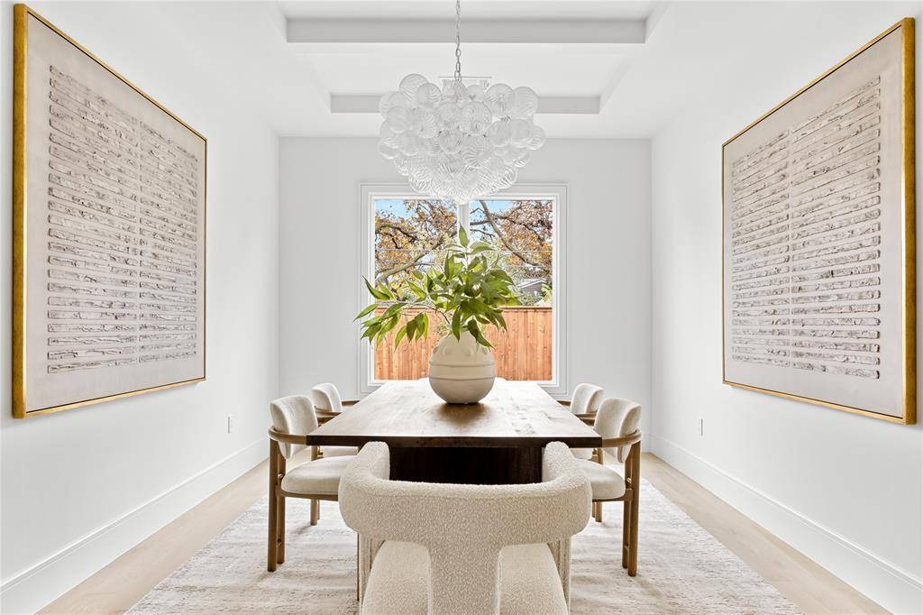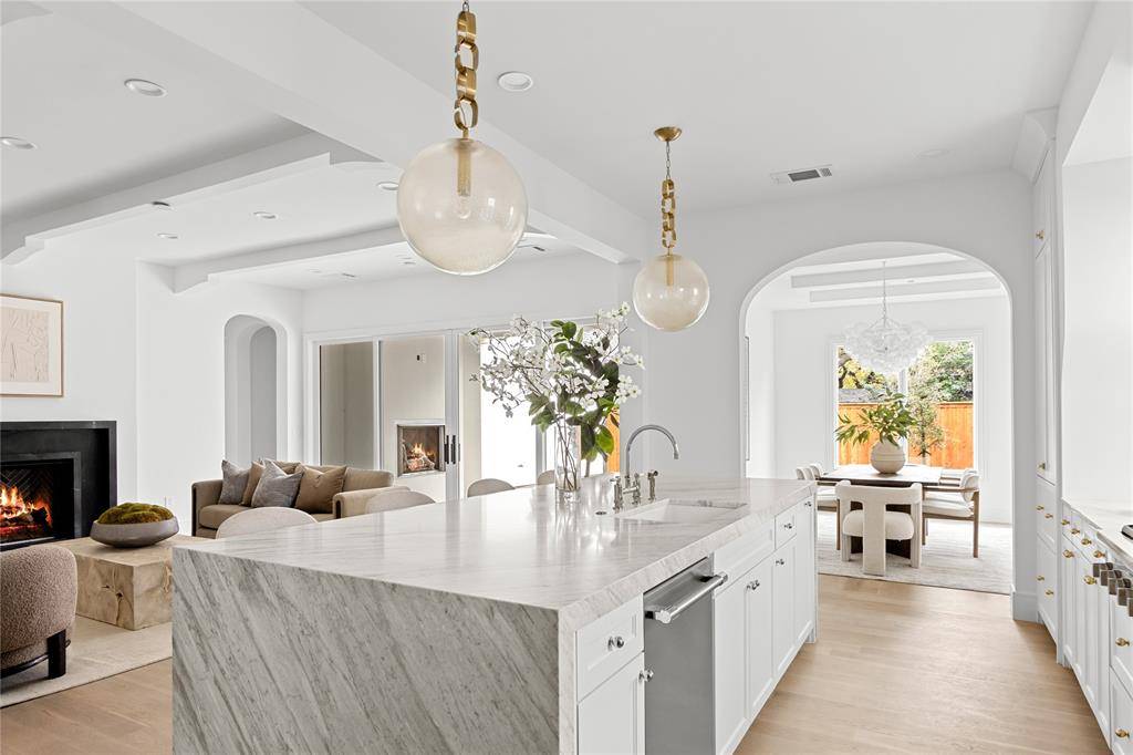 Inside, natural light accentuates refined materials, soft tones, and architectural detailing throughout. The open-concept design connects spacious living and dining areas to a chef's kitchen appointed with custom cabinetry, professional-grade appliances, and a large island that serves as the heart of the home.