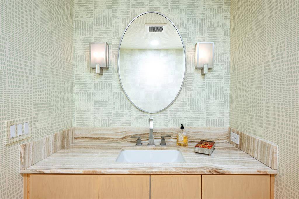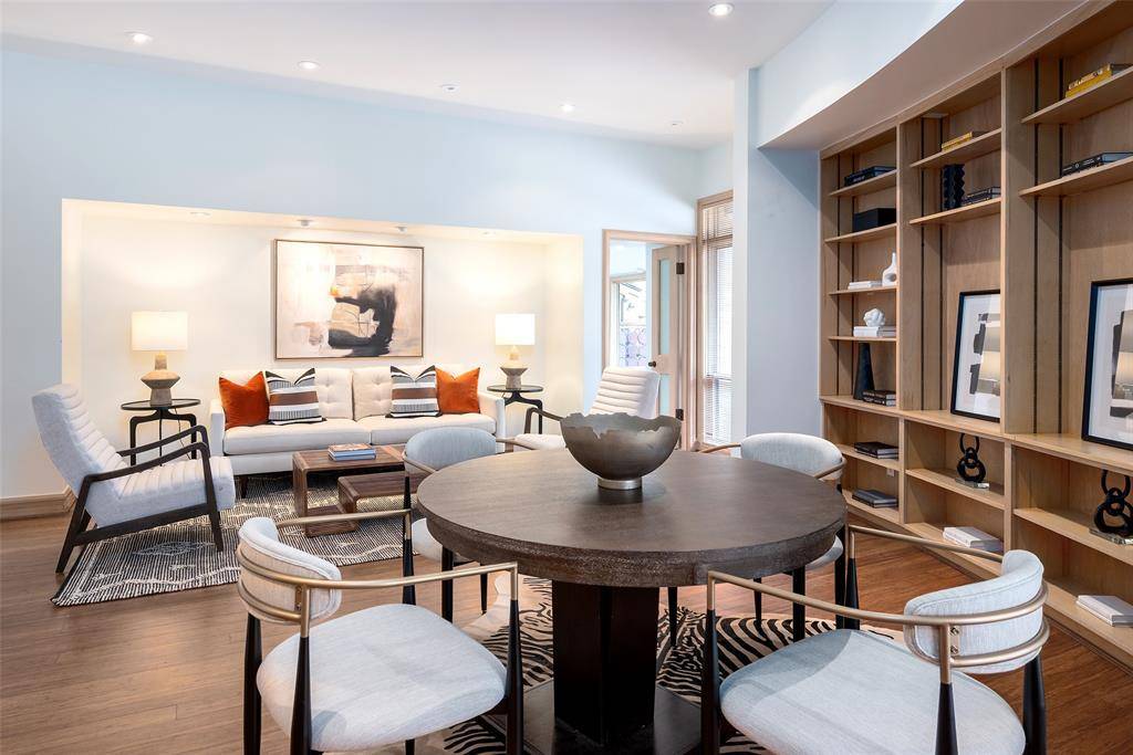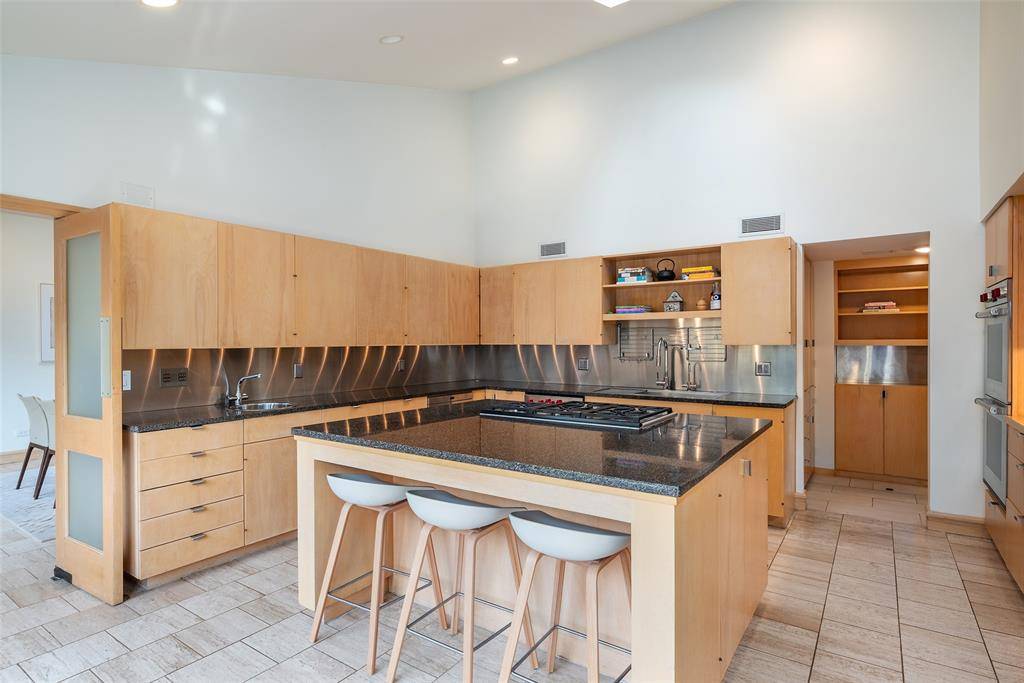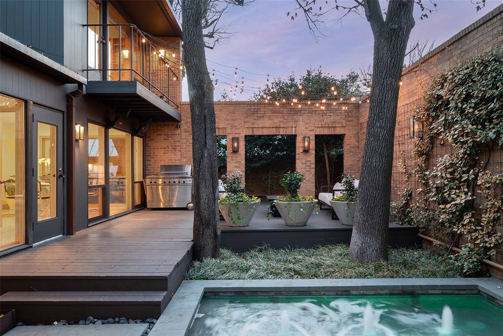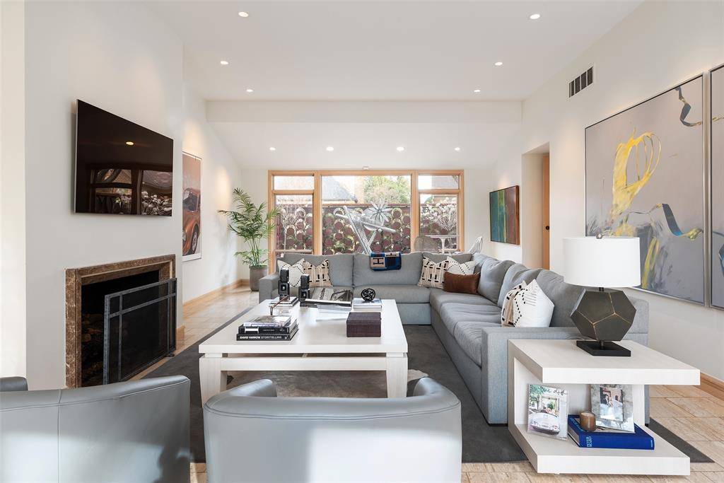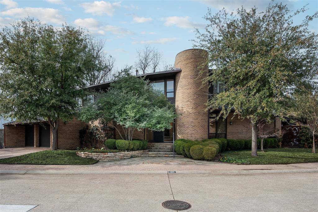 Designed by acclaimed architect Bill Booziotis in the late 1970s, this architecturally significant residence offers timeless sophistication, exceptional privacy, and gallery-style living. Ideal for art collectors, the home features museum-quality lighting, expansive display walls, and abundant natural light. Floor-to-ceiling windows anchor the grand living room and extend through the dining area and hallway, while a custom sculptural iron fence enhances privacy with striking architectural presence. All four bedrooms are upstairs, including a primary suite with dual baths and balcony access overlooking a serene private courtyard with seating and an in-ground water feature. A secondary bedroom also opens to a balcony. A richly appointed den with built-ins and wet bar adds flexibility for entertaining. The kitchen includes recently replaced appliances, and the sunlit breakfast room can serve as a fifth bedroom, office, or studio with adjacent full bath. Additional highlights include architectural lighting, a three-car garage with EV outlet, a heated and cooled dedicated gym, and a 60 kW whole-home generator. Located at 12 Royal Way in a private, limited-access enclave with community pool and tennis court, offering convenient access to the Dallas North Tollway, Love Field, and premier shopping and dining.