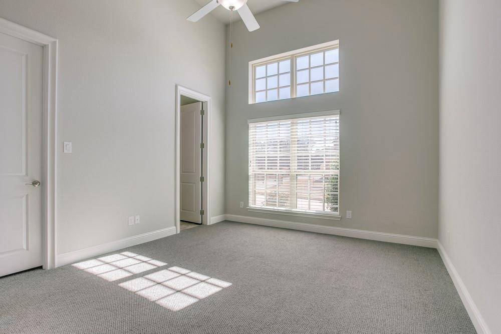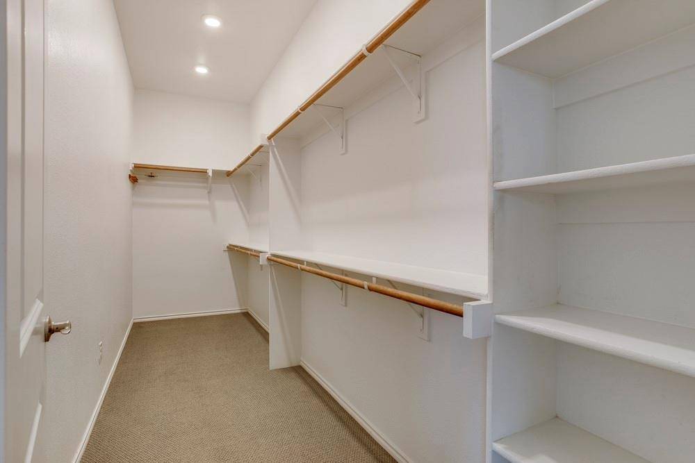 The primary bedroom suite is a true sanctuary, featuring a wall of custom cabinetry, an ensuite bathroom with separate shower and tub, dual vanities, and separate his-her closets providing generous storage, ensuring everything has its place.