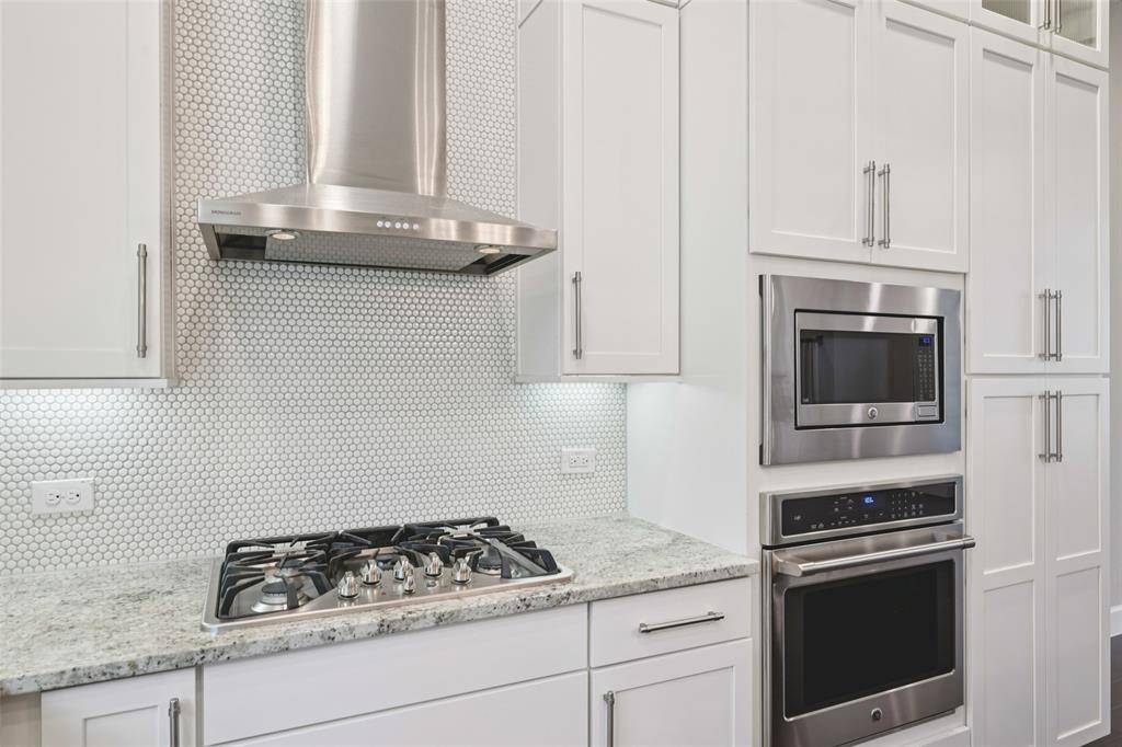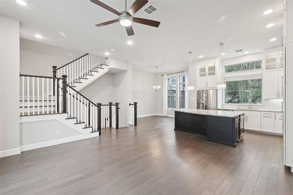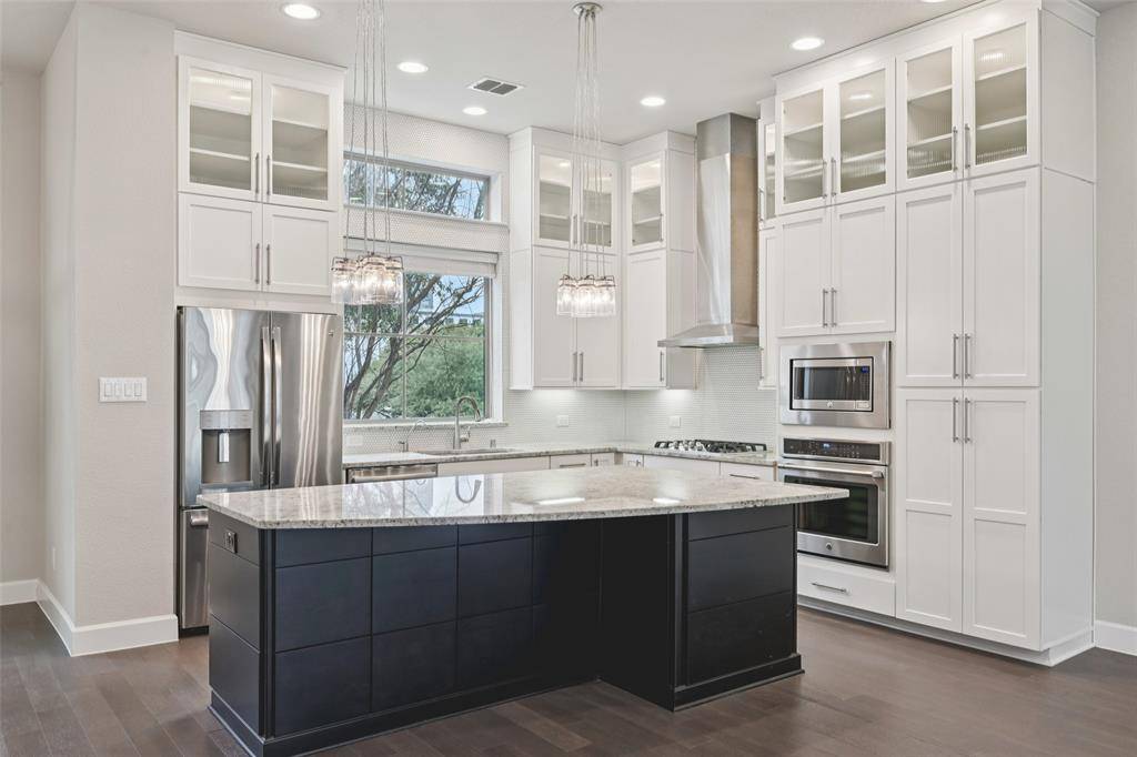 Inside, tall ceilings and expansive windows flood the open-concept living, dining, and kitchen areas with natural light. The chef's kitchen features granite countertops, an oversized island with bar seating, stainless steel appliances, gas cooktop, oven + microwave, and wine fridge—perfect for everyday living and entertaining with friends and family.