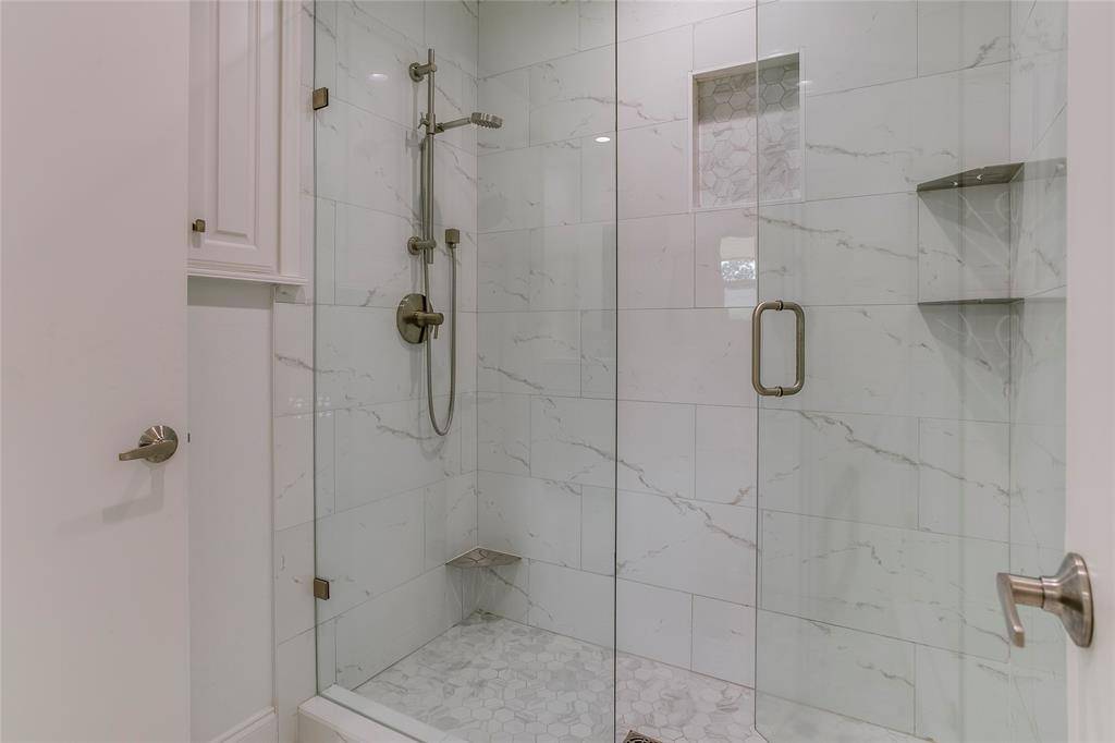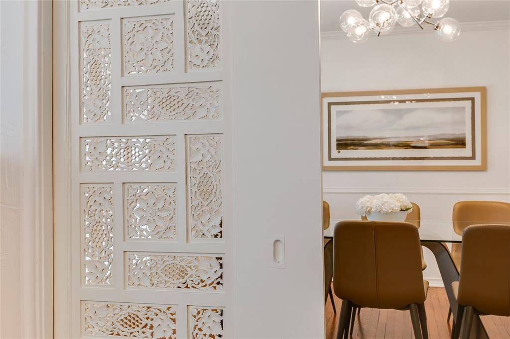 The primary suite includes space for a seating area, dual walk-in closets, direct access to the patio and large pool, ensuite with double vanities, separate shower and soaking tub. Two secondary bedrooms feature renovated en-suites (2022) with a shared shower. A fourth bedroom offers its own renovated en-suite (2022) and built-in office closet, offering excellent flexibility of use. Additional highlights: keyless entry at all rear access points, convenient half-bath, security system, whole-home audio system, added insulation (2022), oversized laundry with storage, two-car garage with built-ins, gated driveways with front and rear access, automatic sprinklers, and more.