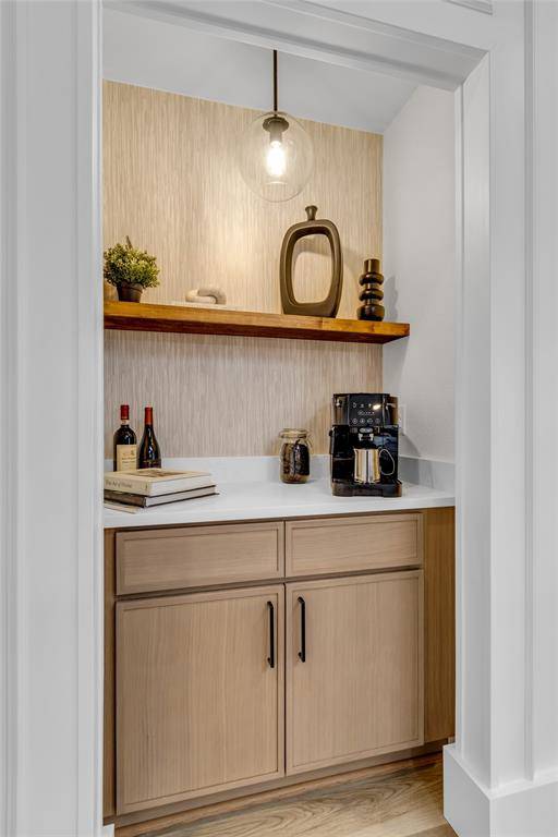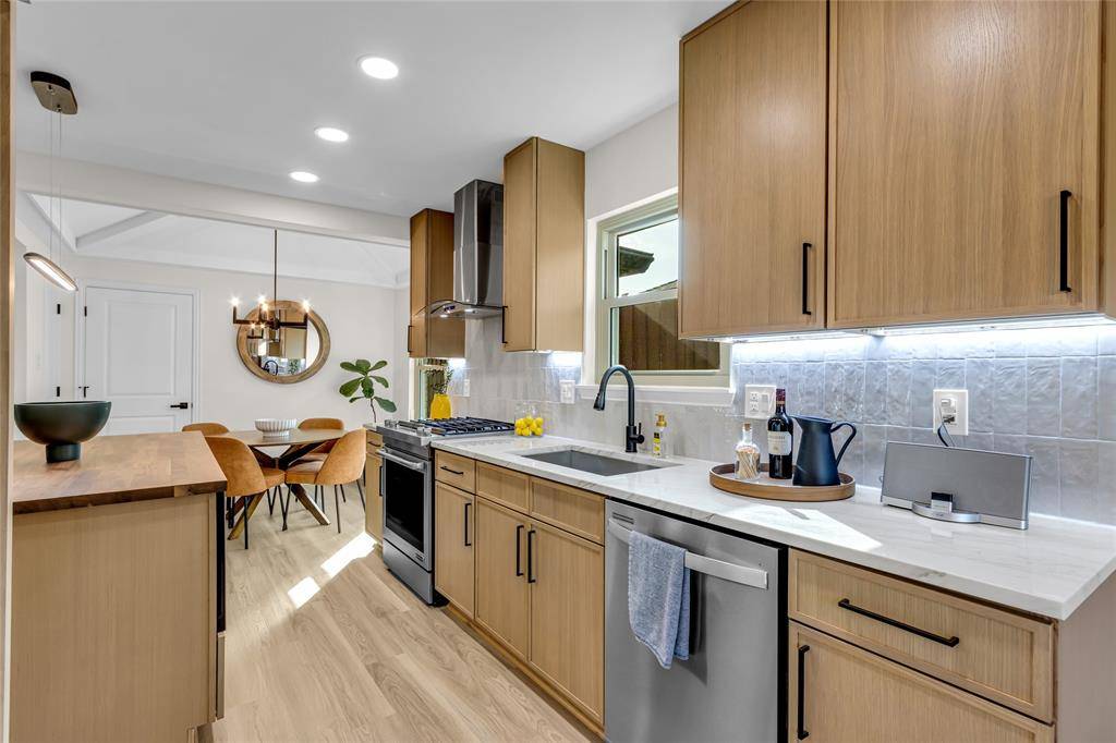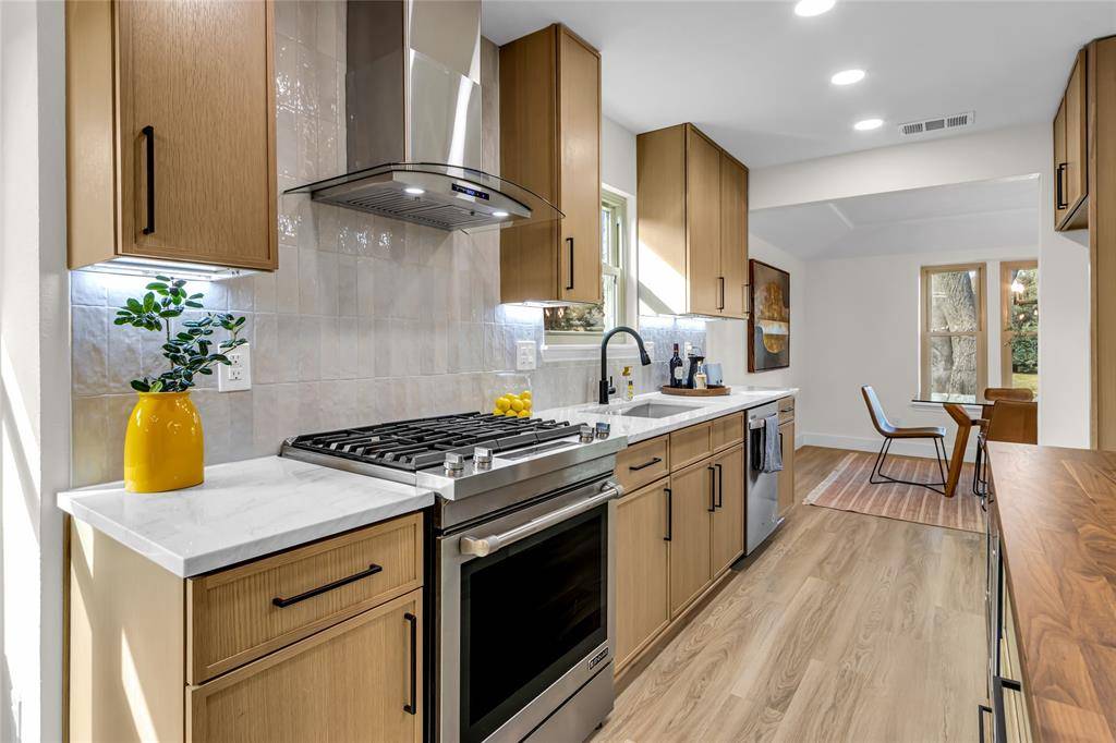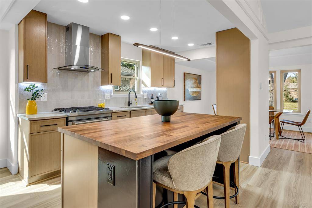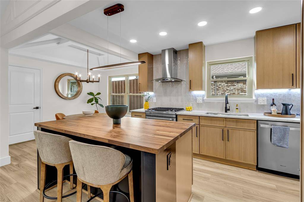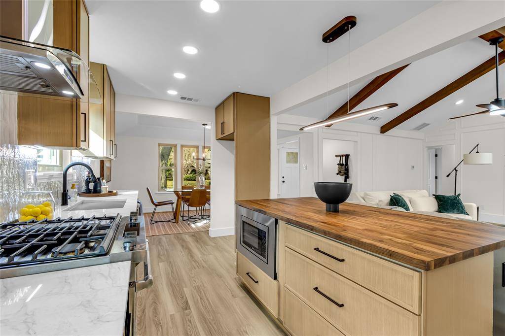 The redesigned kitchen showcases white oak soft-close cabinetry and modern countertops. A butcher-block island with breakfast bar and designer lighting anchors the space. A JennAir gas cooktop, stainless steel appliances, and a walk-in pantry complete the kitchen.