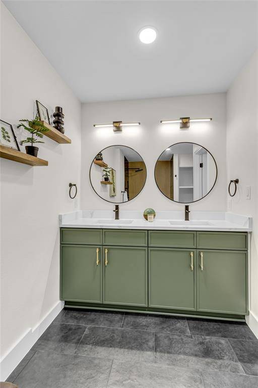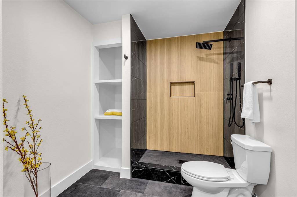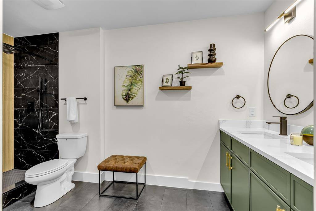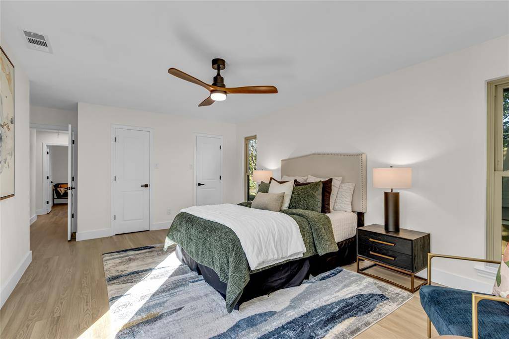 Luxury vinyl plank flooring flows throughout with no carpet, creating a clean and low-maintenance interior. The spacious primary suite features a sliding glass door to the patio and two closets with motion-activated lighting. The primary bath presents a dramatic updated design. Both bathrooms offer modern vanities, ceramic tile floors, and updated lighting.