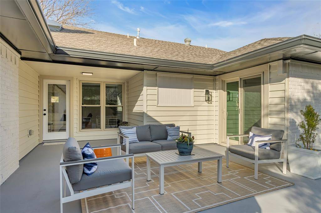A glass patio door opens to a large concrete patio in the private fenced backyard, ideal for outdoor dining and entertaining.