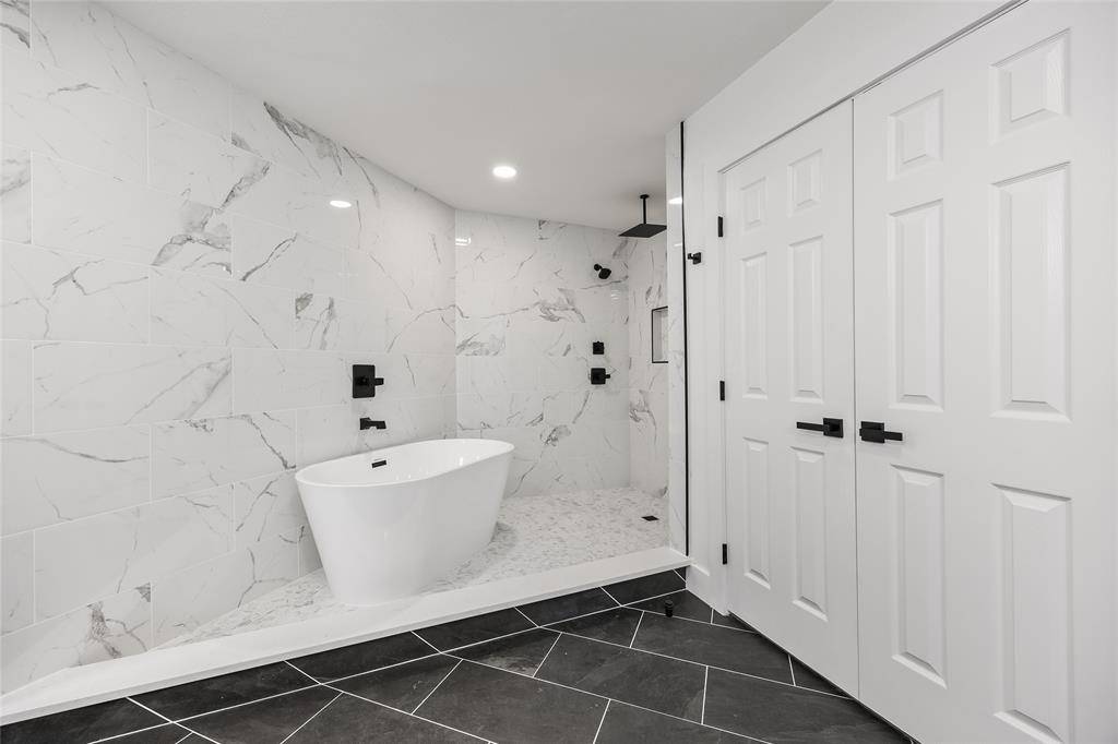 and soaking tub wet-zone enclosure. The shower tile extends all the way to the ceiling and includes