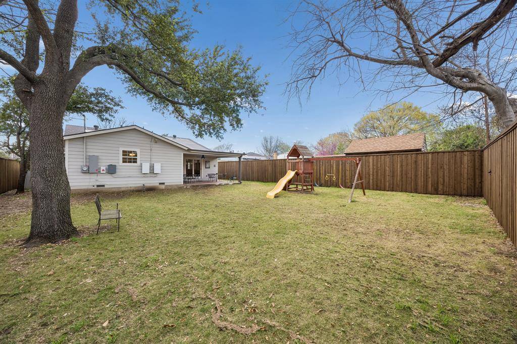 Enjoy outdoor living on the spacious covered patio overlooking a large backyard with lush Zoysia grass and a cedar board-on-board privacy fence—perfect for entertaining, pets, gardening, or play.