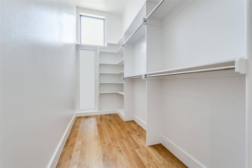 With three bedrooms spread across separate levels, the layout offers privacy and flexibility for guests, work-from-home needs, or additional living space. One bedroom enjoys direct access to a private turfed patio, while another captures views of the Downtown Dallas skyline. The primary suite is designed as a relaxing retreat with a spacious custom closet and a spa-inspired bathroom complete with dual vanities, soaking tub, and an oversized walk-in shower.