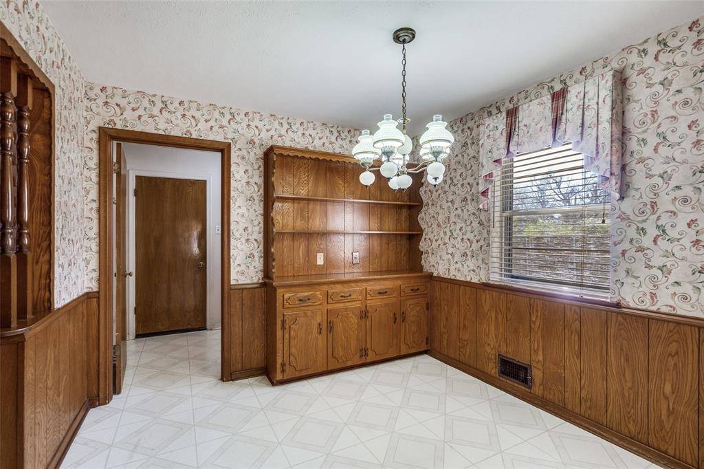Don't miss this incredible opportunity in sought-after Lake Highlands! Nestled in the charming White Rock North subdivision, this home sits on a picturesque quarter-acre lot in what was once an old pecan grove, surrounded by stately, mature trees. The curb appeal is undeniable, with a welcoming covered front porch and a classic bay window that exudes character. Step inside to discover a home full of potential. The terrazzo-tiled entry opens to formal living and dining areas, with the front living space showcasing a vintage bay window that floods the room with natural light. The spacious kitchen flows into a cozy den, complete with a wood-burning fireplace and French doors leading to a 19x16-foot backyard deck—perfect for entertaining or relaxing under the shade of towering pecan trees. There's even ample room to add a pool while preserving plenty of play space.