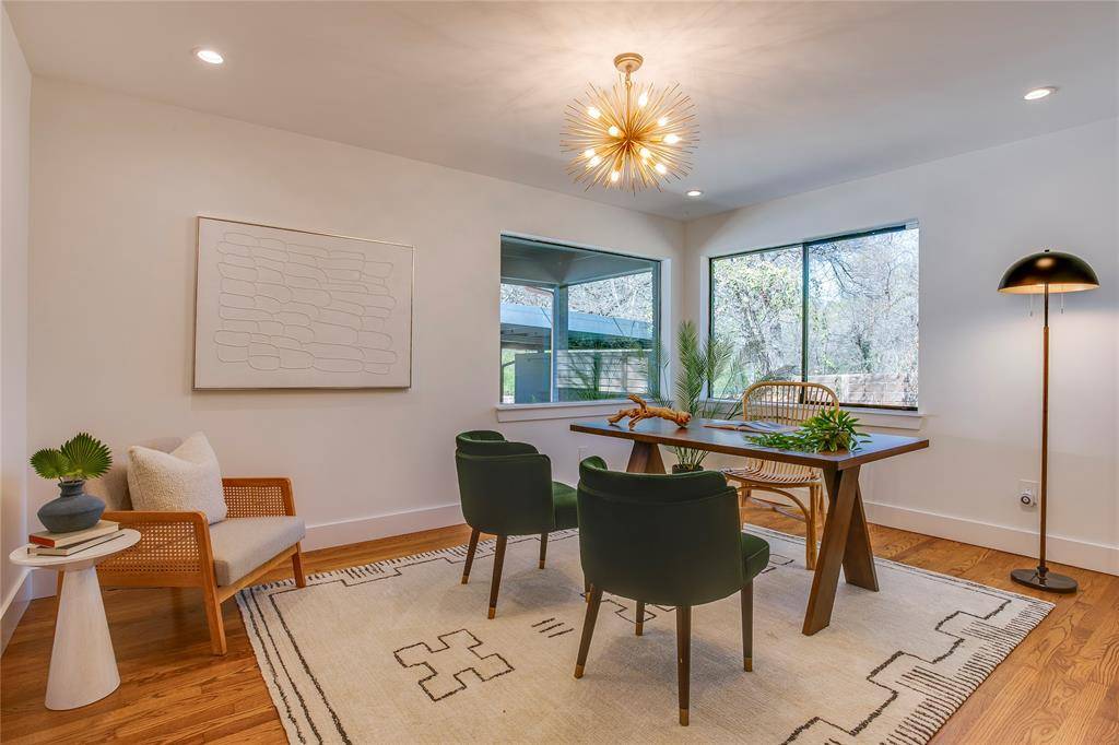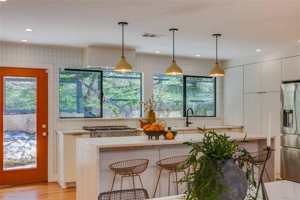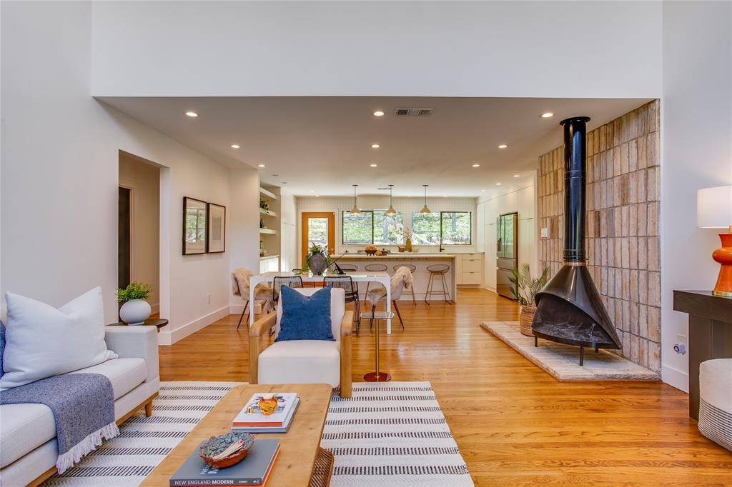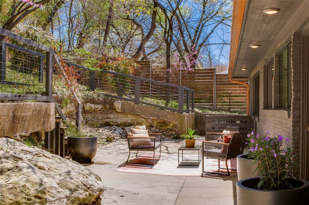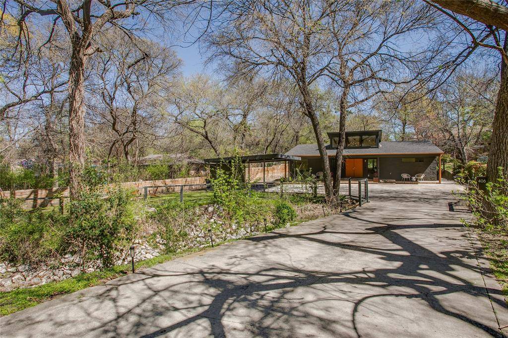 Tucked along one of Oak Cliff's most enchanting tree-lined streets, this exquisitely reimagined mid-century residence feels both quietly sophisticated and effortlessly livable. Set on a rare 0.38-acre creekside lot on Ravinia Drive, the home unfolds as a private retreat where architecture, nature, and thoughtful design converge. Inside, light moves freely through an open, gallery-like interior where vaulted ceilings, smooth-finish walls, and warm hardwood floors establish a refined yet inviting atmosphere. The living spaces center around a vintage Preway fireplace, creating an intimate focal point for evenings of quiet comfort or relaxed entertaining. The kitchen is both chic and functional—anchored by honed marble countertops, a generous island, and premium appliances —offering a space equally suited for everyday living or elevated gatherings. Taken down to the studs in 2020, the home's meticulous renovation is felt throughout where every finish was curated with intention. Modern systems—including updated electrical and plumbing, spray-foam insulation, and a recently replaced roof, windows, HVAC, and water heater—ensure the home lives as comfortably as it looks.