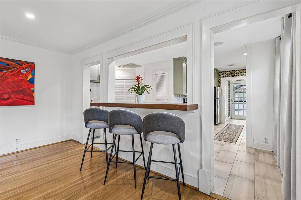 The kitchen has been beautifully refreshed with refinished cabinetry, a new backsplash, updated tile flooring, and a custom window above the sink that fills the space with natural light. A refinished walnut bar adds warmth and functionality, creating an inviting setting for both everyday living and entertaining.