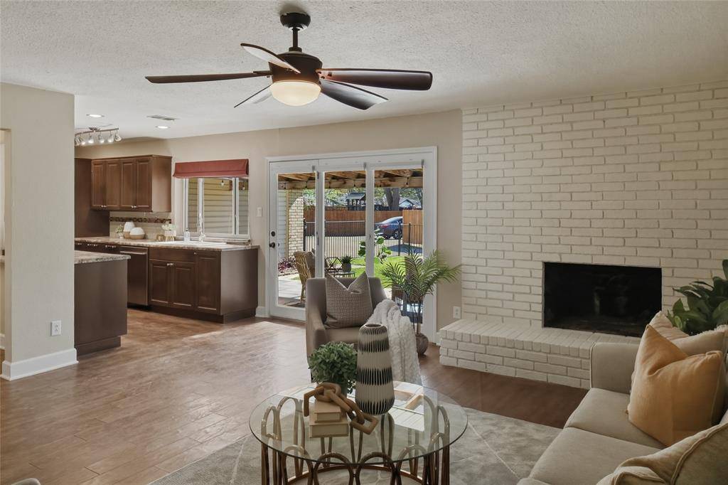 The Kitchen offers sleek custom cabinetry, an electric cooktop, a backyard view, and a wall oven-microwave combo. The open-concept living room is anchored by a classic brick fireplace and features glass doors that dissolve the line between indoor comfort and outdoor relaxation. Step outside to your backyard, complete with an oversized concrete patio, a rugged timber pergola featuring custom bistro lighting, and storage shed.