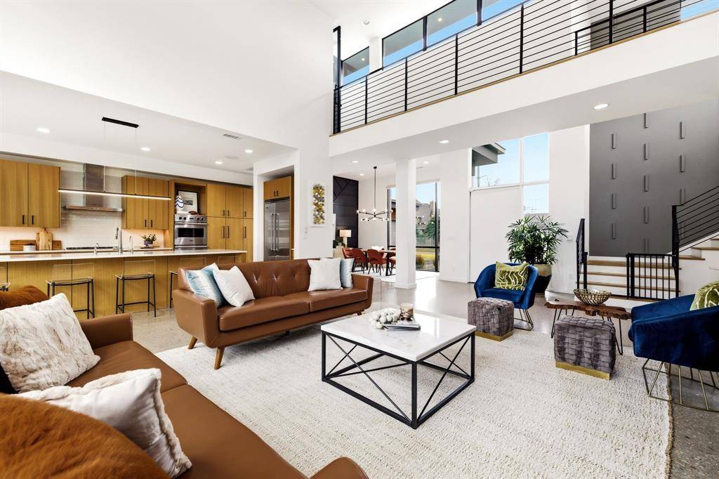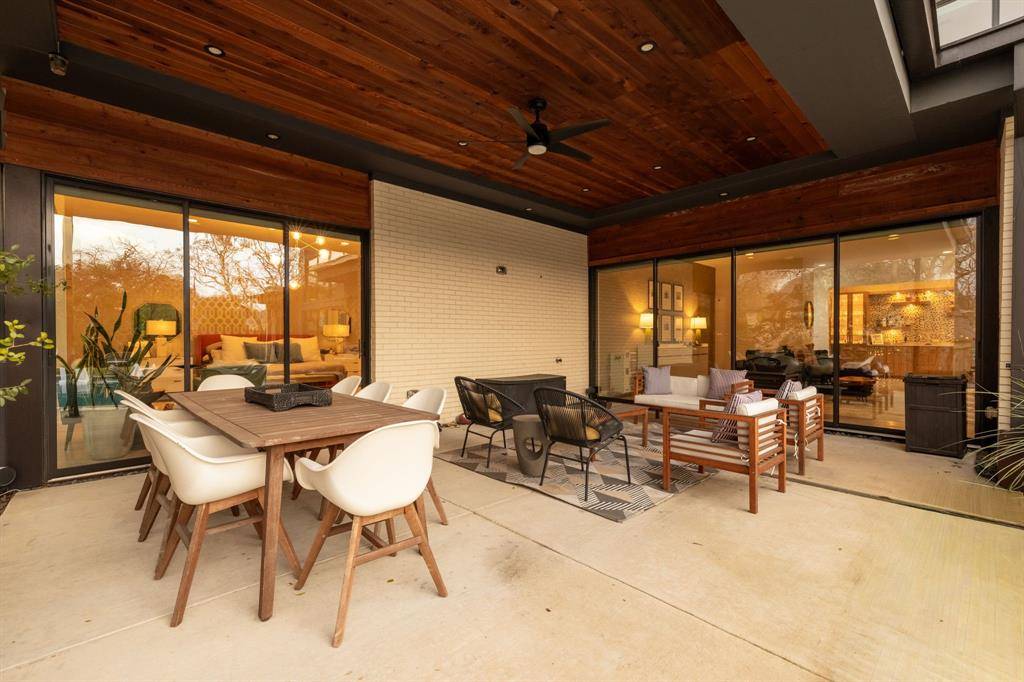 The home's centerpiece is a sprawling chef's kitchen, designed for connection. It features a unique serving window to the backyard and flows effortlessly into an open dining area and family room anchored by soaring, two-story ceilings. On beautiful Texas days, retractable sliding glass doors disappear to reveal a private, resort-style oasis. This outdoor sanctuary boasts an ozone purification pool, a sunken fire pit, and an outdoor kitchen with a built-in grill, all framed by multiple green spaces and a custom- built playhouse that architecturally mirrors the main