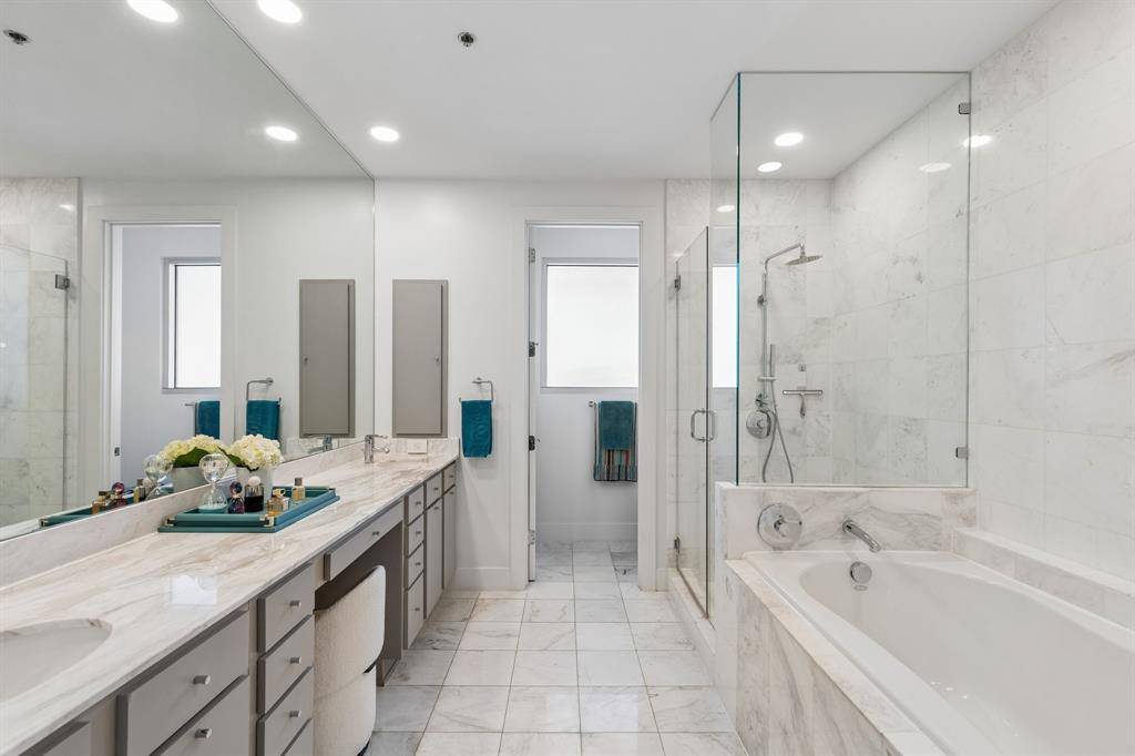 Two spacious primary suites offer custom walk-in closets and spa-inspired marble baths with dual vanities, soaking tubs, and large showers. The third ensuite bedroom functions beautifully as a private study or guest retreat.