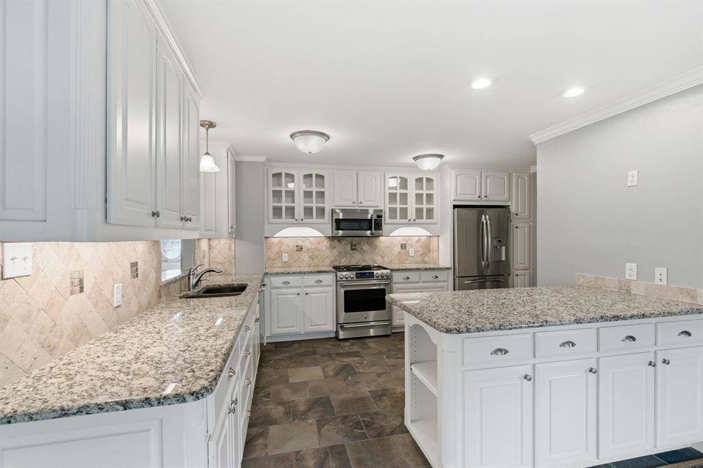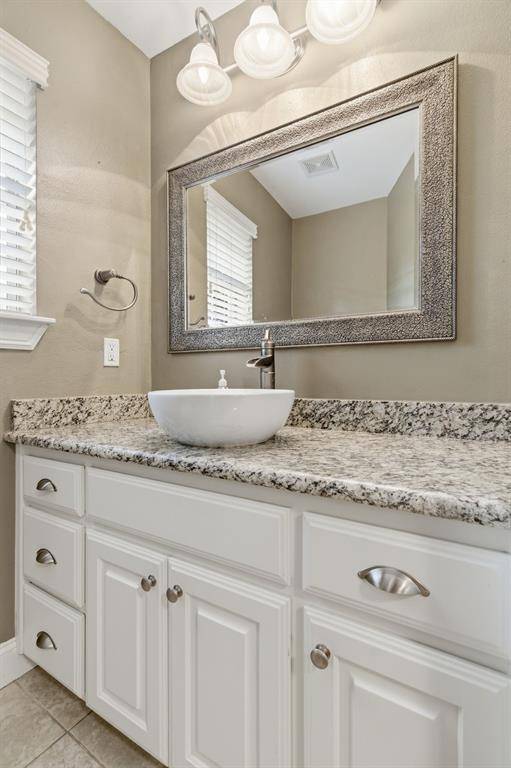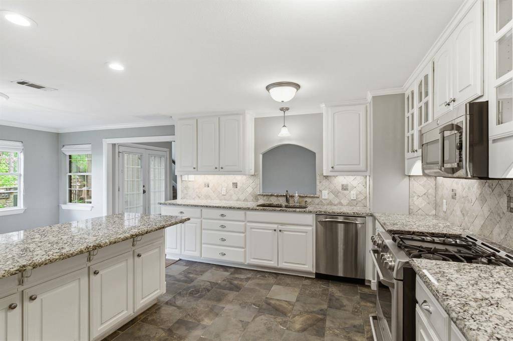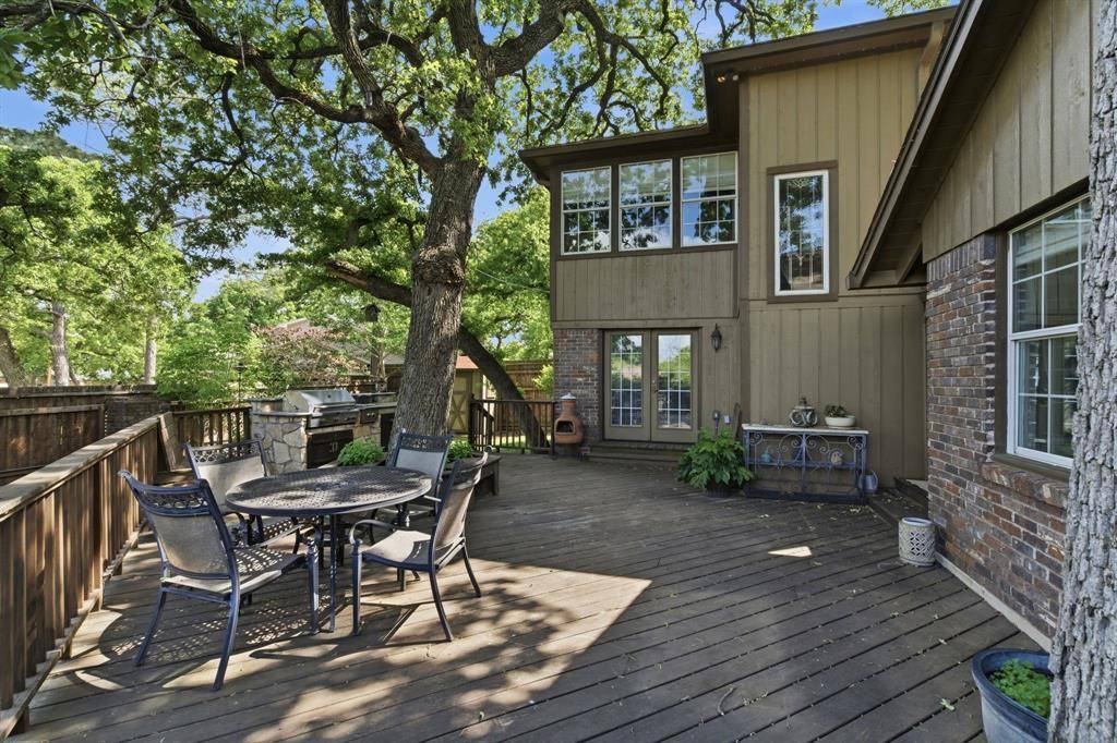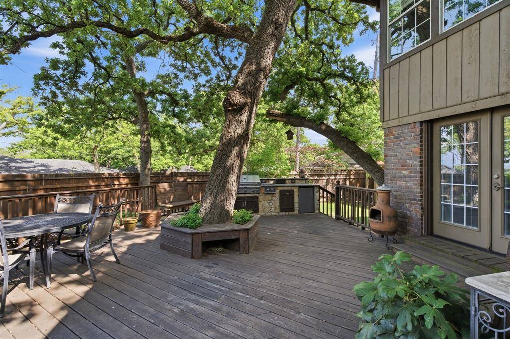 Inside, you'll find a flexible floor plan that offers the option for either an upstairs or downstairs primary suite. This home is full of character both inside and out—far from the typical cookie-cutter home. The family room showcases a stunning wood-burning rock fireplace that serves as a warm and inviting focal point. The kitchen has been tastefully updated and is ideal for both everyday living and entertaining, featuring a commercial-grade gas range, granite countertops, stainless steel appliances, a breakfast or buffet bar, and a generously sized dining area. Just off the garage is an incredibly versatile space that includes a full-size laundry room, a secluded half bath, and a flexible work area that could easily serve as a hobby space, mudroom, home office, or additional storage area. Upstairs offers potential for a private retreat with views of nearby Lake Grapevine—an ideal setting for a relaxing, spa-like primary suite or quiet escape. From the unique architectural details to the serene backyard setting, this home offers character, flexibility, tons of storage areas and an unbeatable location in one of the area's most desirable neighborhoods. BUYER TO CONFIRM SCHOOLS (DOVE ELEM MAY CHANGE), ROOM SIZES ARE APPROXIMATE.